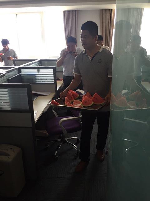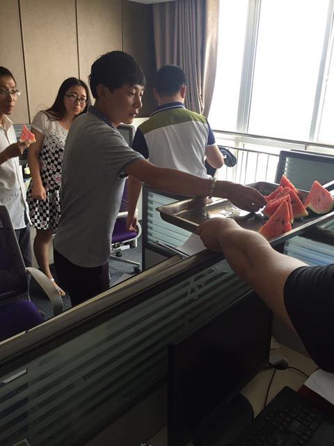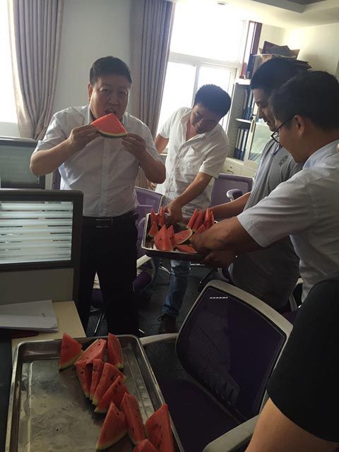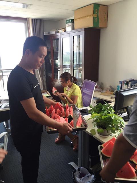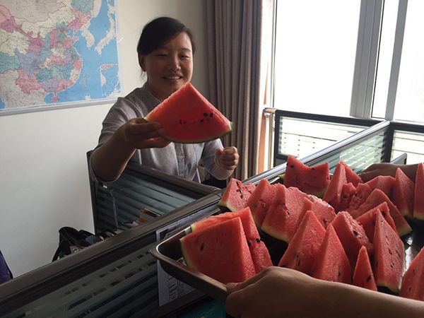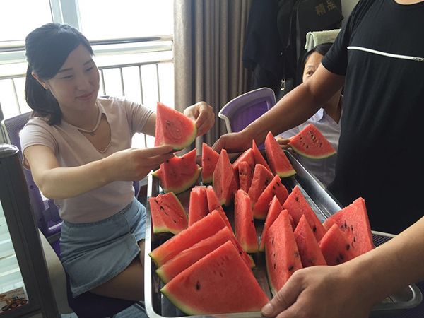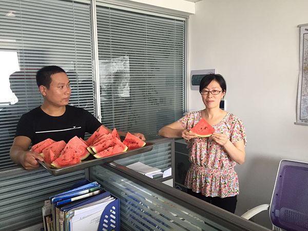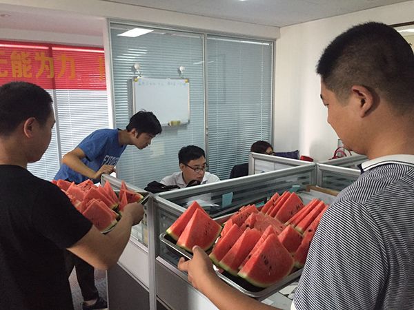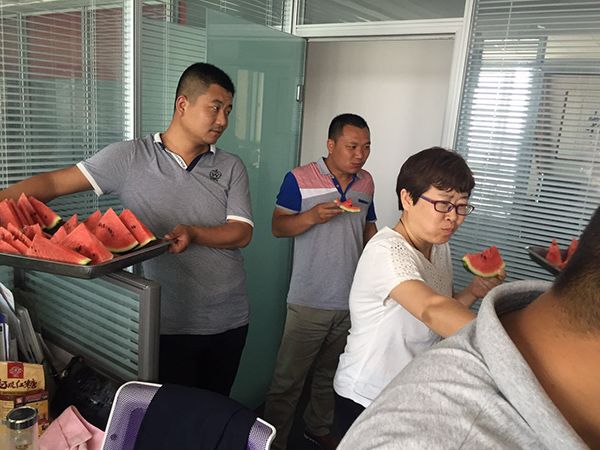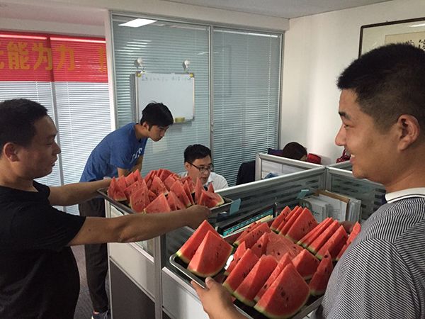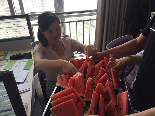 高溫持續(xù)不斷,繼昨日工會主席發(fā)放酸梅粉之后,今天公司領(lǐng)導(dǎo)購買十幾個香甜可口的西瓜,切好后發(fā)到員工手里,這個夏天,不再熱!
