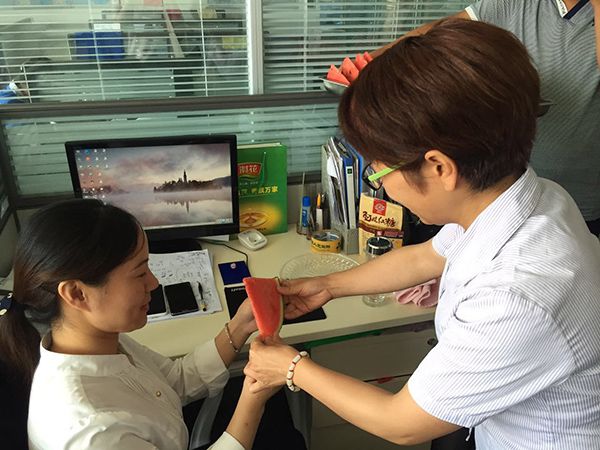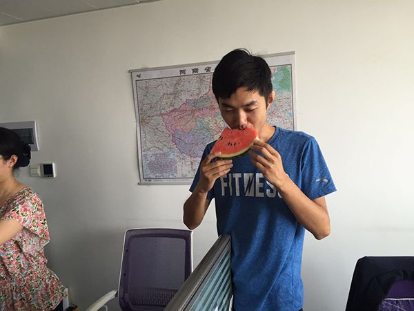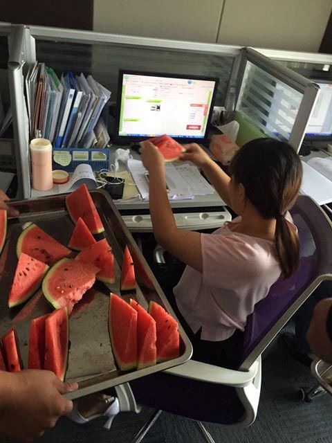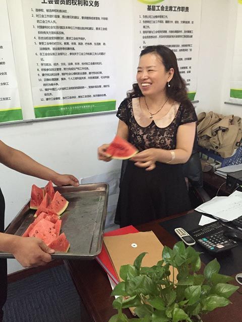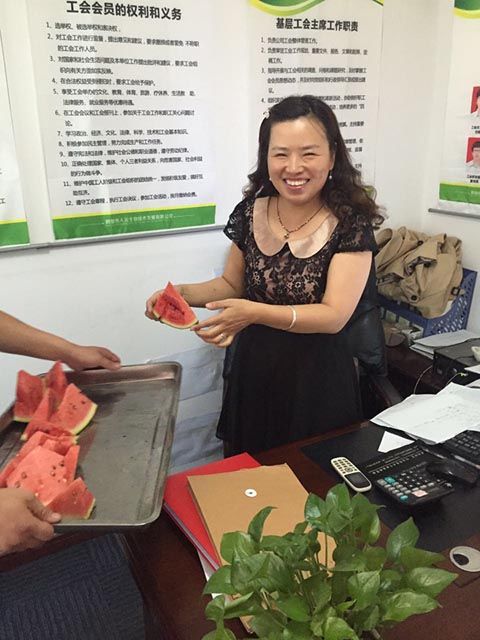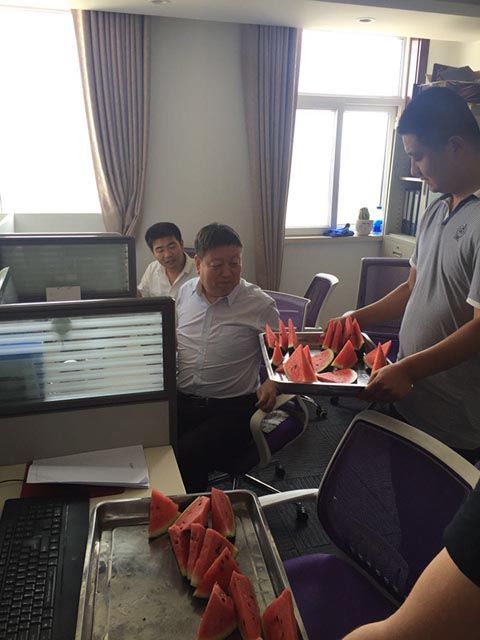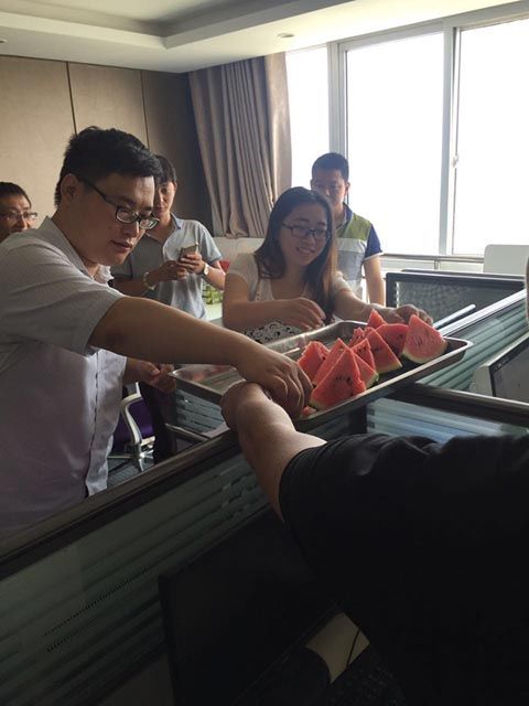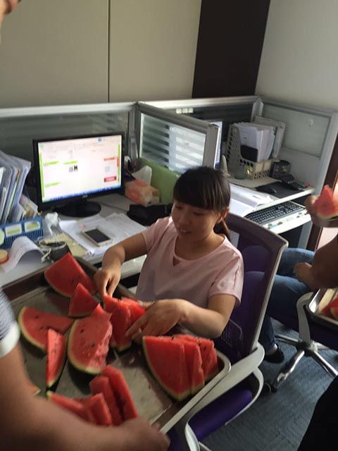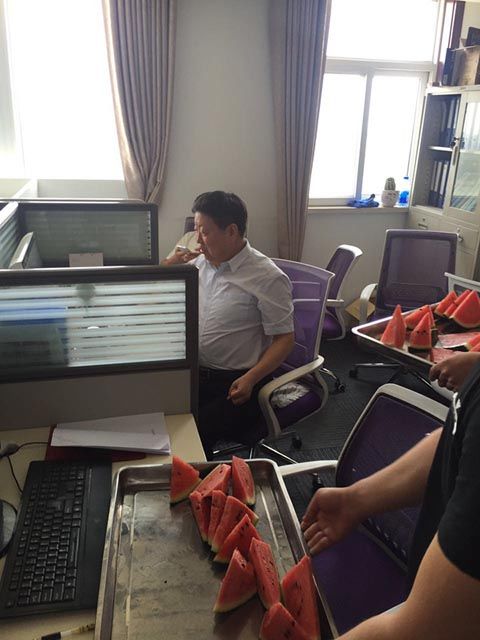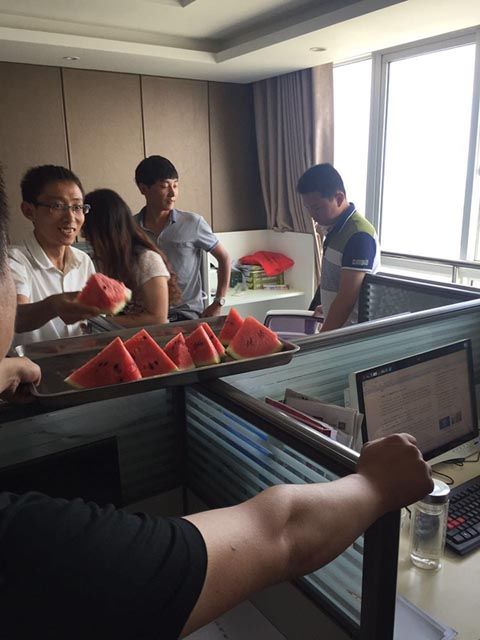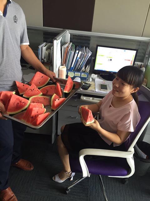 高溫持續(xù)不斷,繼昨日工會主席發(fā)放酸梅粉之后,今天公司領(lǐng)導(dǎo)購買十幾個香甜可口的西瓜,切好后發(fā)到員工手里,這個夏天,不再熱!